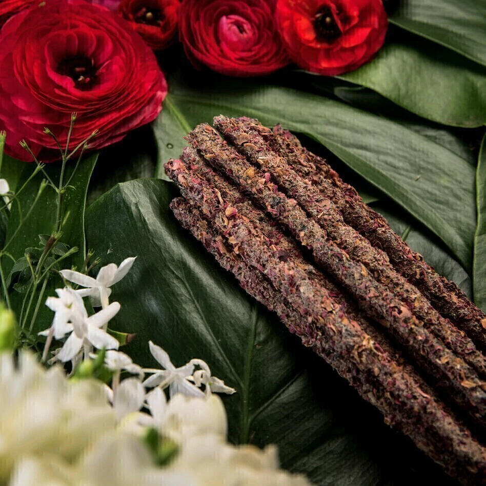Composição: Flores de jasmim, pétalas de rosa, óleo concentrado de jasmim e rosas, carvão vegetal, biomassa de frutas, aglutinante natural e sal.
